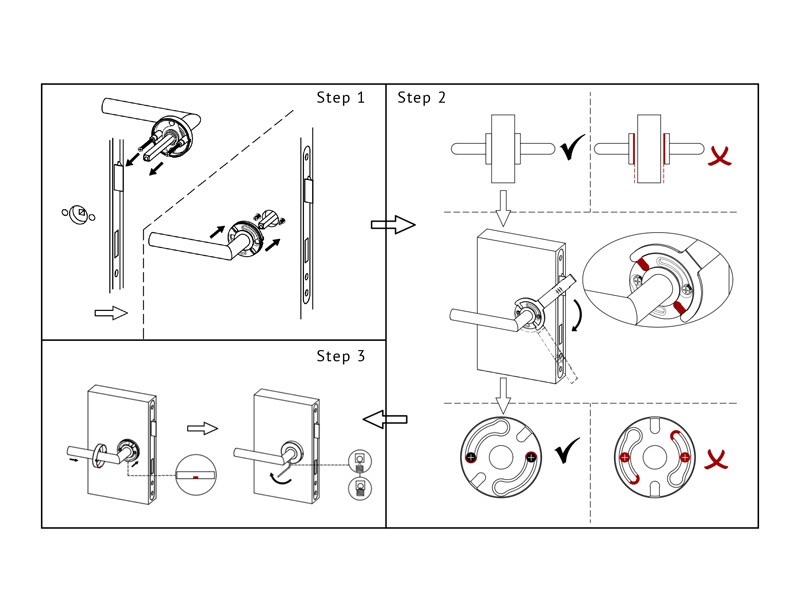 Step 1. Put handle set into the door. Pre-installed lever for outdoor.
