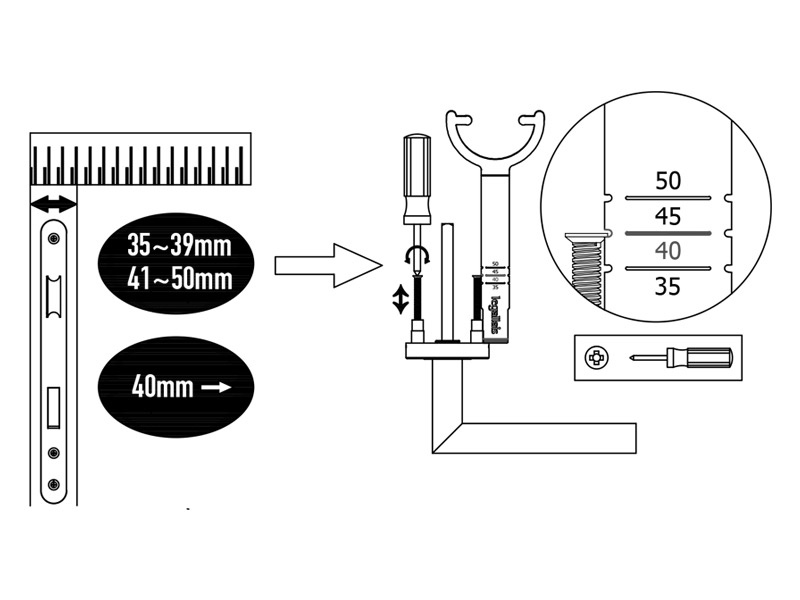 Pre-installed door thickness = 40mm, go to Step 1. Other thickness: